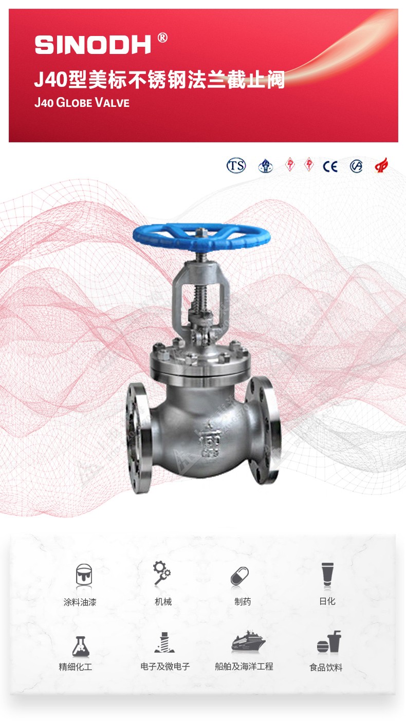 J40型美标不锈钢截止阀,为半岛官方网站自主研发生产。本产品的设计制造符合美国国家标准ANSIB16.34,美国石油学会标准AP1 6D和AP I 600要求,产品结构紧凑密、刚性好、封性性能优秀是一种最常见的启闭阀,利用闸板的上下工作来接通(全开)和截断(全关)管道中的流体介质。